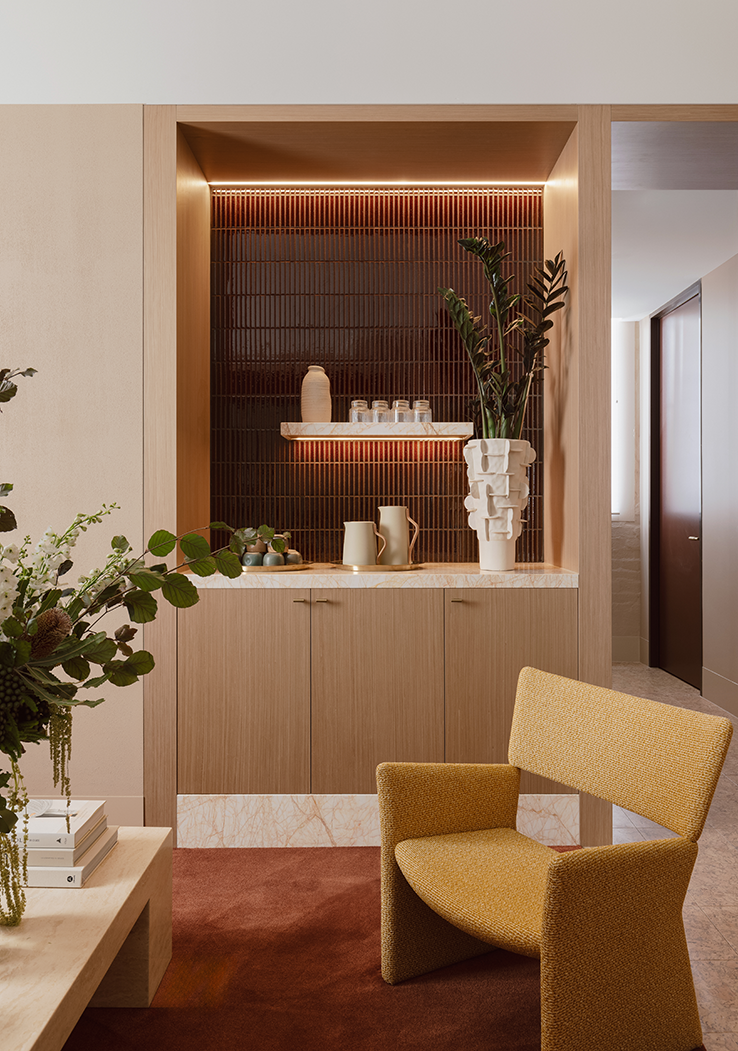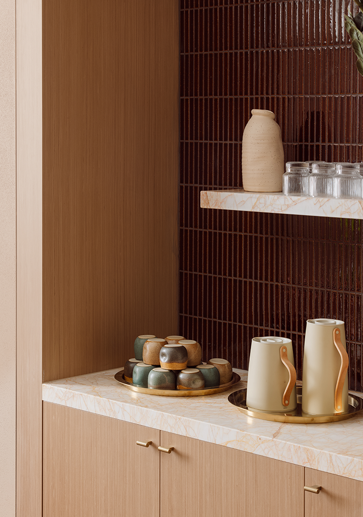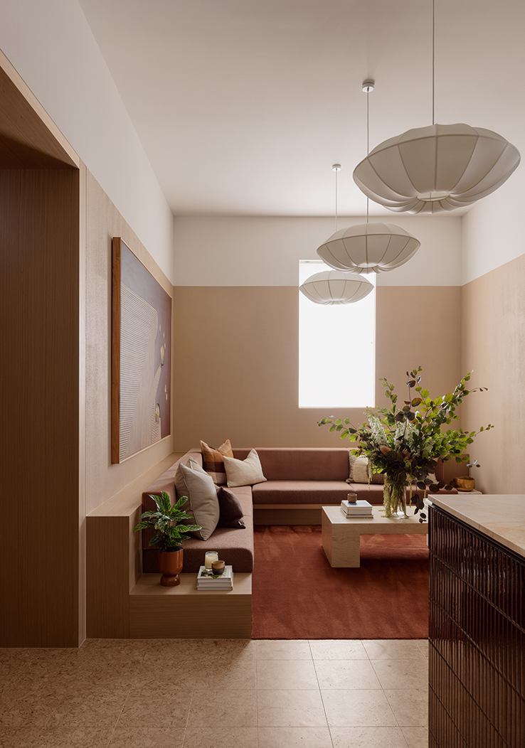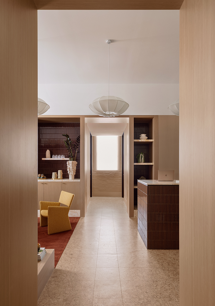 The design response leverages the site’s generous ceiling height to create an open and inviting reception area, anchored by a consistent datum line, a custom banquette lounge, and softly layered lighting to establish a sense of intimacy. A warm and tactile material palette—including a tiled reception counter, rendered finishes, and textured fabrics—introduces a sense of depth and character to the front-of-house experience.