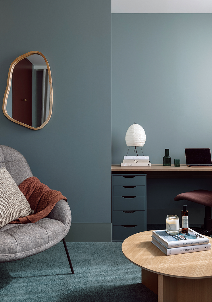 Cork flooring and warm timber tones guide users through the space, culminating in a series of consulting suites defined by soft furnishings and a calming palette of muted blues. The result is a considered, tranquil environment that supports it’s commitment to holistic mental health care, while offering a space that feels both professional and deeply personal.