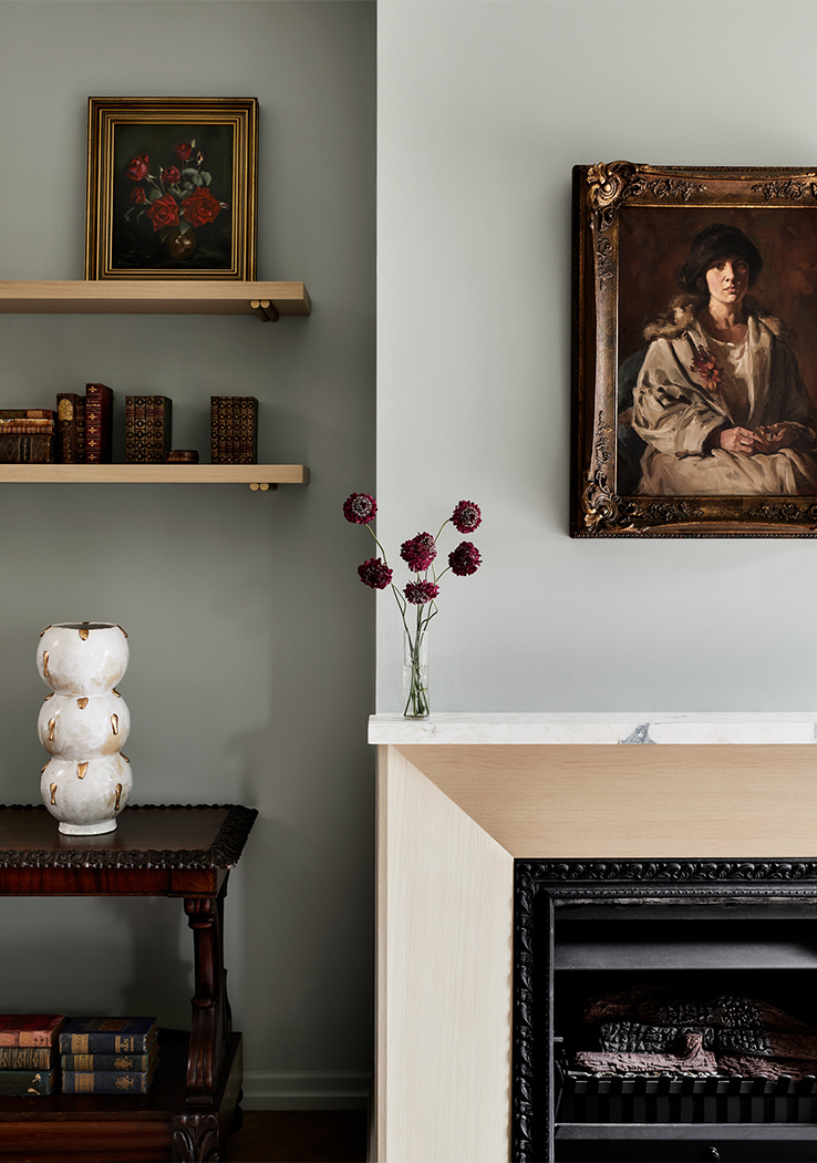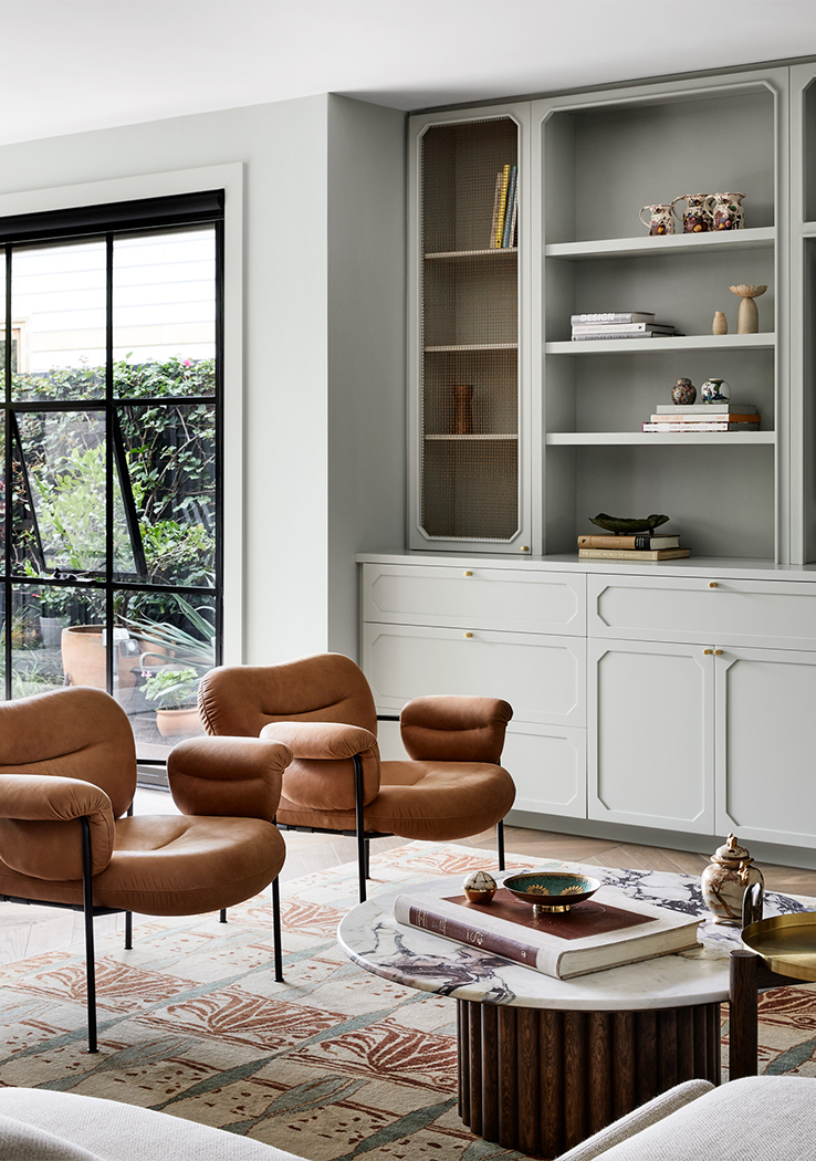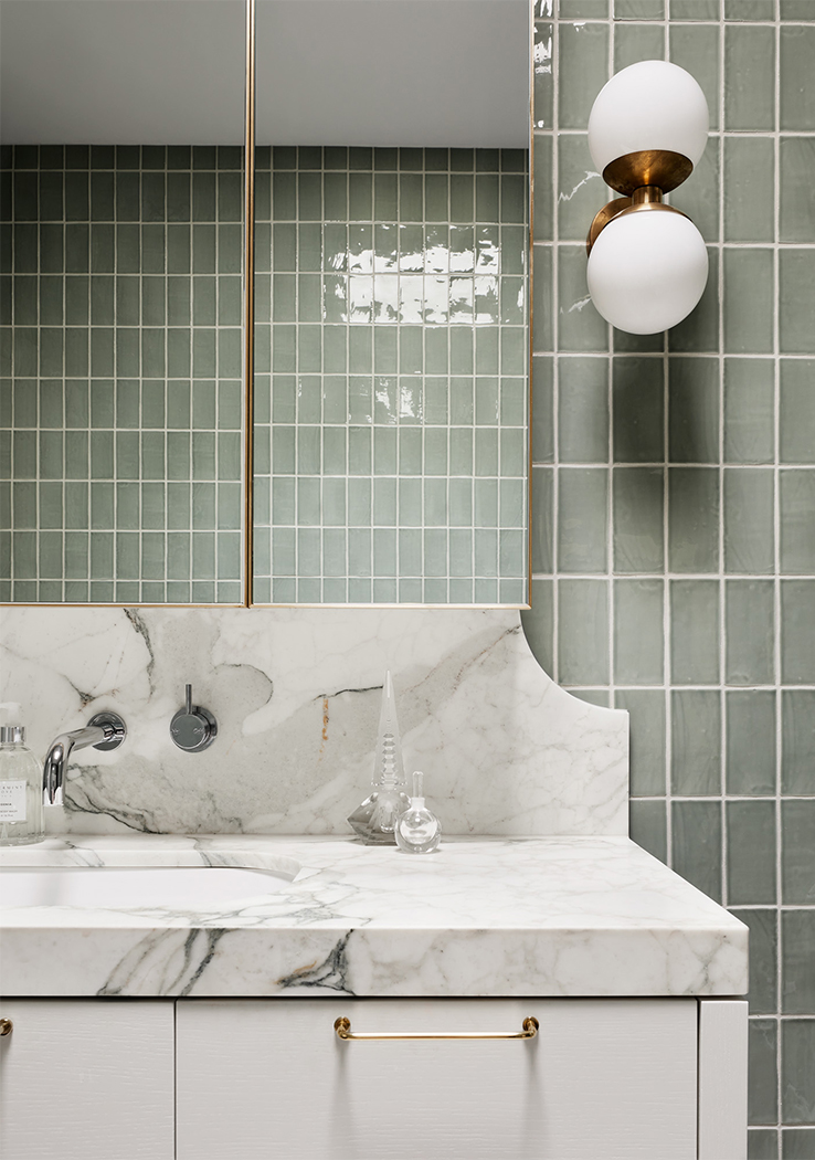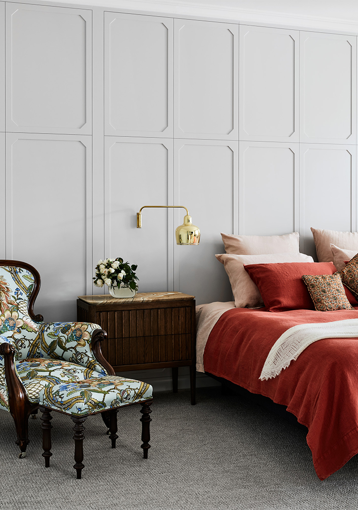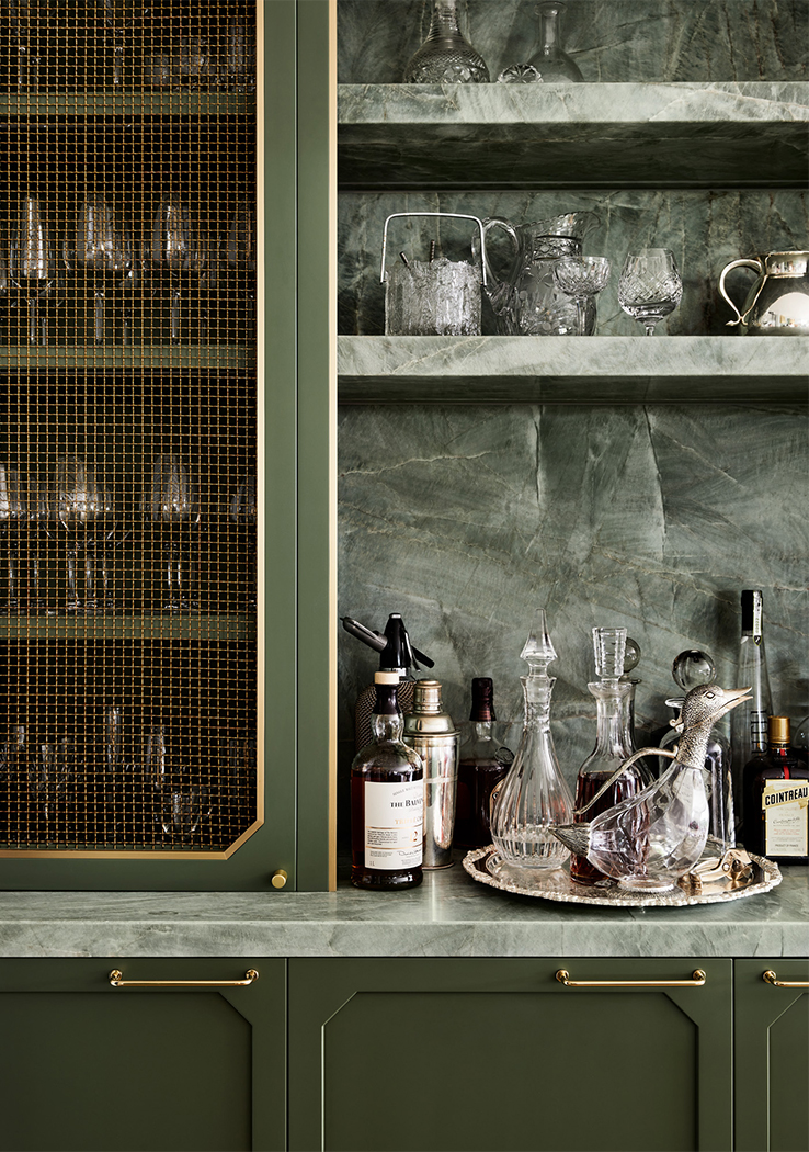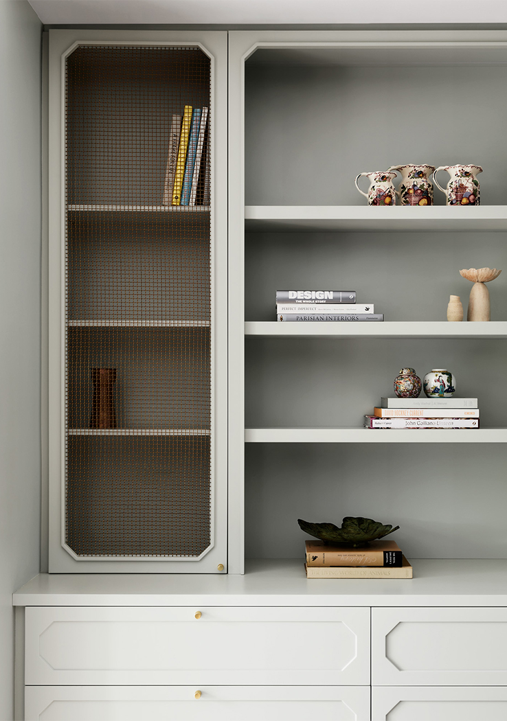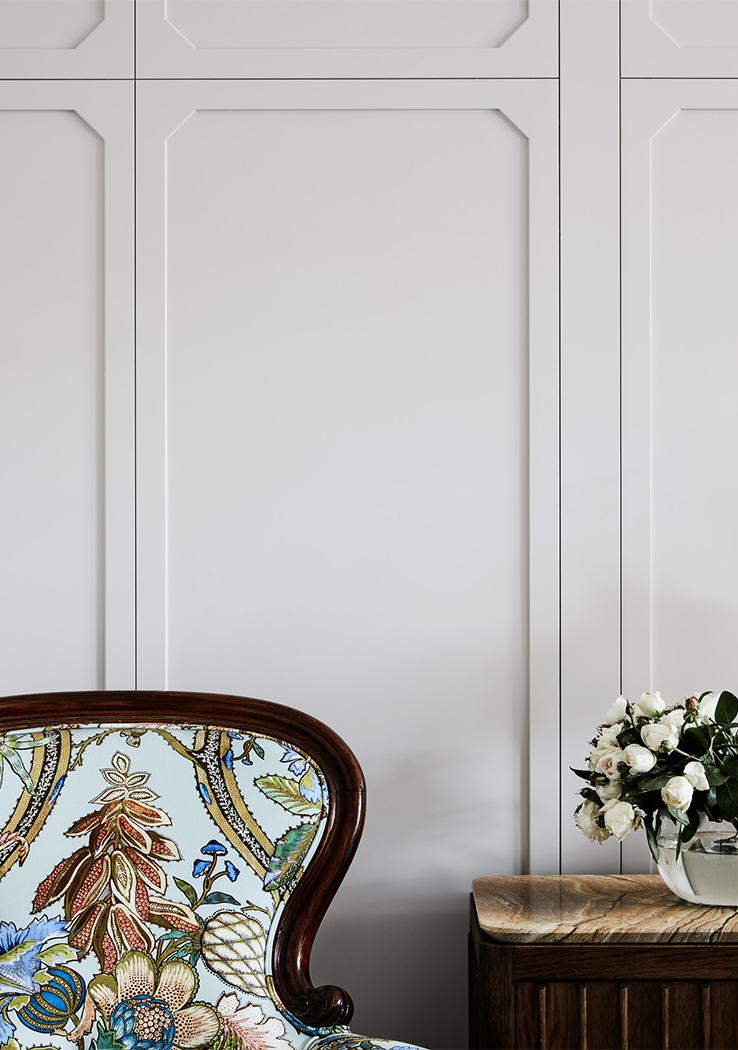 The kitchen features a statement brass rangehood with an oversized island bench conceived as a family gathering area, able to seat the clients’ six grandchildren. The addition of a workable butler’s pantry and glamorous bar adjacent to the kitchen reflect the vivacious owners’ love of cooking and entertaining while showcasing their collection of glassware and other pieces. The same sophisticated approach is evident throughout the home from the free-standing vanity with scalloped stone edge in the bathroom, to the emphasis placed on display, with interesting pieces from the owners’ travels now easily curated.