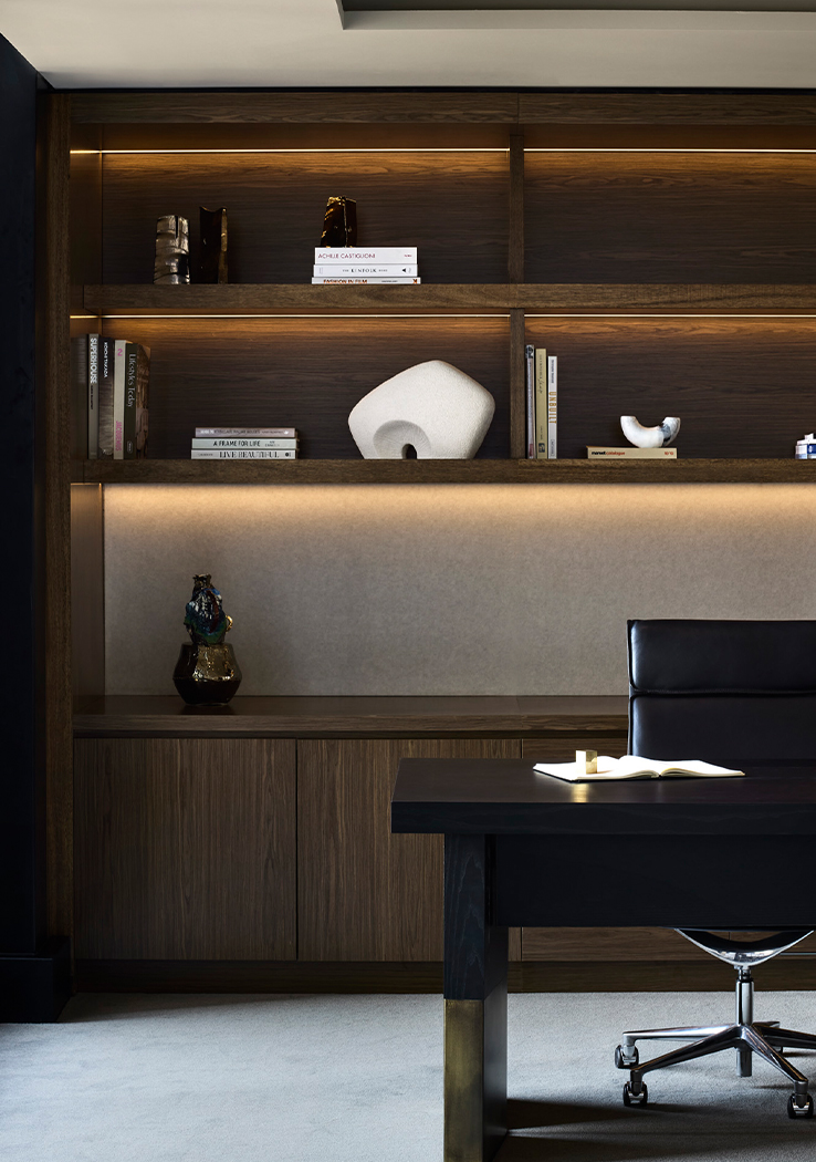 Omega Advance Solutions Limited utilised the floor plan’s east wing to host a boardroom, meeting rooms, collaboration space, quiet rooms and chairman’s office, finished in deep, moody finishes. Beyond, the longer west wing accommodates a light-filled open-plan workspace and Managing Director’s office, each afforded striking views across the bay. Adjacent joinery elegantly conceals lightboxes, white boards, pin boards, storage, and meeting booth utilities – highly functional, yet thoughtfully detailed to engender warmth, and encourage staff collaboration.